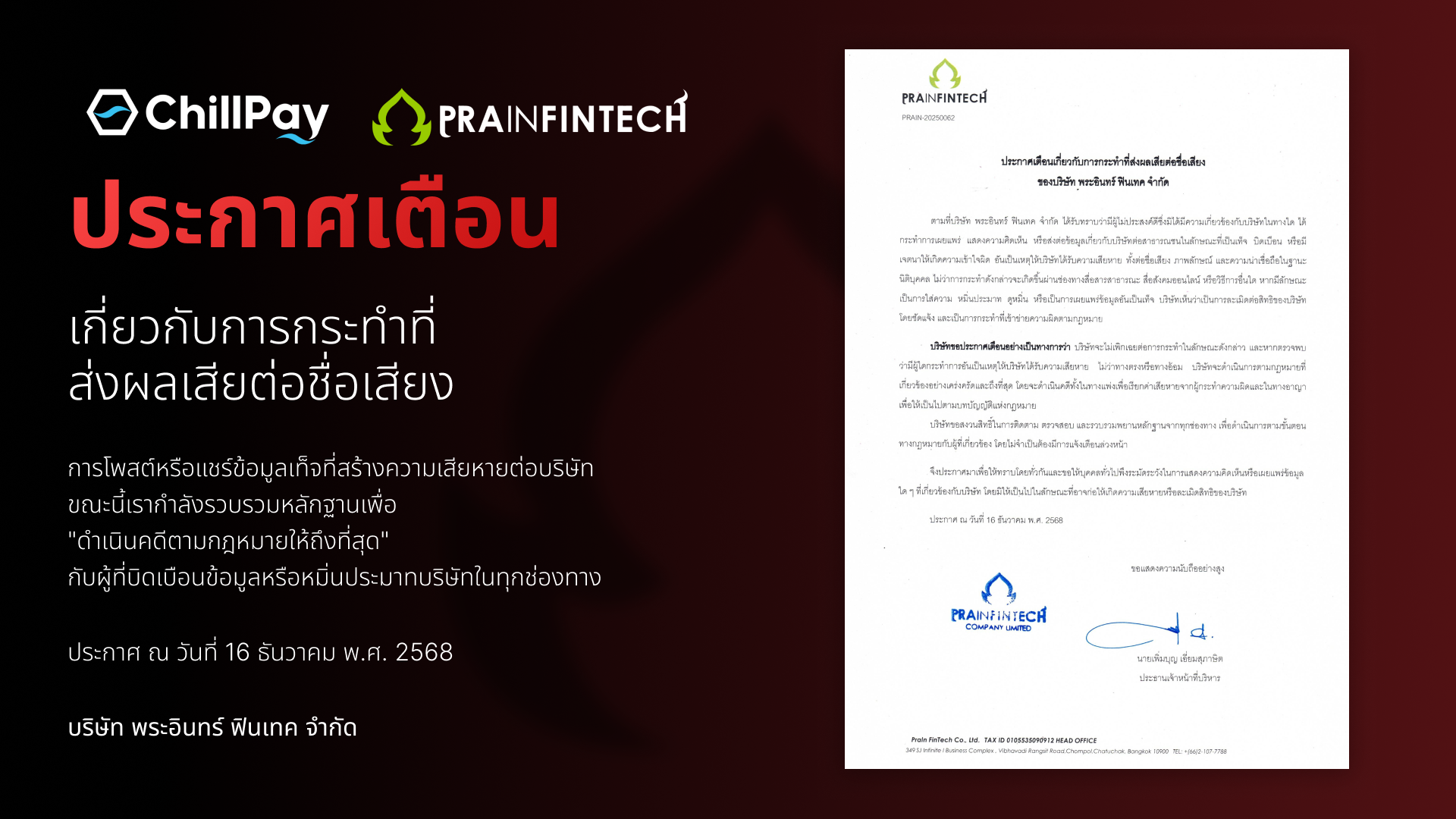 ตามที่บริษัท พระอินทร์ ฟินเทค จำกัด ได้รับทราบว่ามีผู้ไม่ประสงค์ดีซึ่งมิได้มีความเกี่ยวข้องกับบริษัทในทางใด ได้กระทำการเผยแพร่ แสดงความคิดเห็น หรือส่งต่อข้อมูลเกี่ยวกับบริษัทต่อสาธารณชนในลักษณะที่เป็นเท็จ บิดเบือน หรือมีเจตนาให้เกิดความเข้าใจผิด อันเป็นเหตุให้บริษัทได้รับความเสียหาย ทั้งต่อชื่อเสียง ภาพลักษณ์ และความน่าเชื่อถือในฐานะนิติบุคคล ไม่ว่าการกระทำดังกล่าวจะเกิดขึ้นผ่านช่องทางสื่อสารสาธารณะ สื่อสังคมออนไลน์ หรือวิธีการอื่นใด หากมีลักษณะเป็นการใส่ความ หมิ่นประมาท ดูหมิ่น หรือเป็นการเผยแพร่ข้อมูลอันเป็นเท็จ บริษัทเห็นว่าเป็นการละเมิดต่อสิทธิของบริษัทโดยชัดแจ้ง และเป็นการกระทำที่เข้าข่ายความผิดตามกฎหมาย